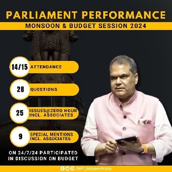 ਲੁਧਿਆਣਾ, 10 ਅਗਸਤ (ਕੁਨਾਲ ਜੇਤਲੀ) : ਲੁਧਿਆਣਾ ਤੋਂ ਸੰਸਦ ਮੈਂਬਰ (ਰਾਜ ਸਭਾ) ਸੰਜੀਵ ਅਰੋੜਾ ਨੇ ਸ਼ੁੱਕਰਵਾਰ ਨੂੰ ਸਮਾਪਤ ਹੋਏ ਸੰਸਦ ਦੇ ਮਾਨਸੂਨ ਅਤੇ ਬਜਟ ਸੈਸ਼ਨ 2024 ਦੌਰਾਨ ਸ਼ਾਨਦਾਰ ਪ੍ਰਦਰਸ਼ਨ ਕੀਤਾ। ਅਰੋੜਾ ਨ...