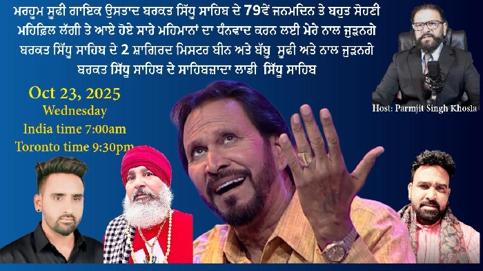 ਸੂਫ਼ੀ ਗਾਇਕ ਮਿਸਟਰ ਬੀਨ ਆਸਟ੍ਰੇਲੀਆ, "ਪੀਐੱਸਕੇ ਮੀਡਿਆ ਗਰੁੱਪ ਪੰਜਾਬ" ਤੇ ਲਾਈਵ ਹੋ ਕੇ ਕਲਾਕਾਰਾ ਦਾ ਕਰਨਗੇ ਧੰਨਵਾਦਉਸਤਾਦ ਬਰਕਤ ਸਿੱਧੂ ਸਾਬ ਦੇ ਜਨਮ ਦਿਨ ਨੇ ਲਿਆ ਇੱਕ ਵਿਸ਼ਾਲ ਮੇਲੇ ਦਾ ਰੂਪ : ਗਾਇਕ ਮਿਸਟਰ ਬੀਨ ਆਸਟ੍ਰੇ...
