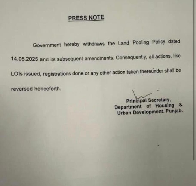 ਪੰਜਾਬ ਸਰਕਾਰ ਨੇ ਲੈਂਡ ਪੂਲਿੰਗ ਨੀਤੀ ਲਈ ਵਾਪਸ